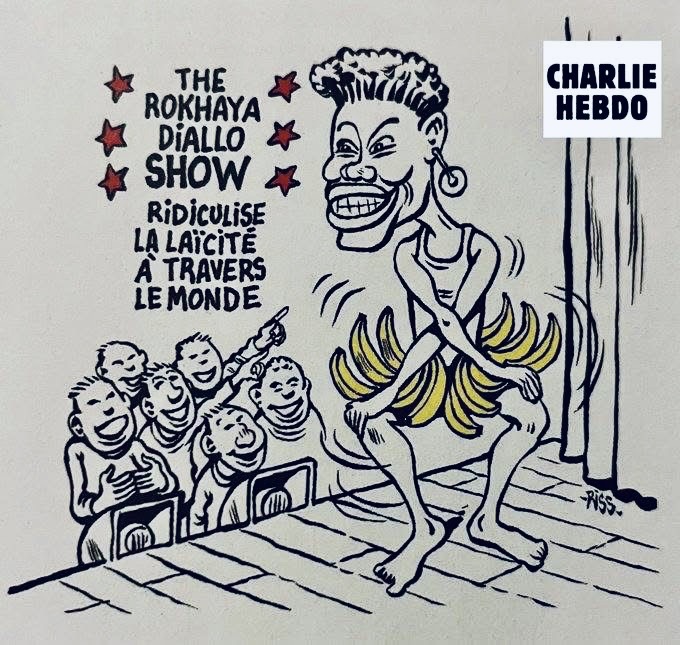 La publication incriminée par Charlie Hebdo, prétendument satirique, ne se situe pas sur le terrain du débat d’idées. Elle s’inscrit dans une iconographie historiquement documentée : 𝑐𝑒𝑙𝑙𝑒 𝑑𝑒 𝑙𝑎 𝑟𝑒́𝑑𝑢𝑐𝑡𝑖𝑜𝑛 𝑑𝑒𝑠 𝑝𝑒𝑟𝑠𝑜𝑛𝑛𝑒𝑠 𝑛𝑜𝑖𝑟𝑒𝑠 𝑎̀ 𝑑𝑒𝑠 𝑐𝑜𝑟𝑝𝑠 𝑐𝑎𝑟𝑖𝑐𝑎𝑡𝑢𝑟𝑒́𝑠, 𝑒𝑥𝑜𝑡𝑖𝑠𝑒́𝑠 𝑒𝑡 𝑎𝑛𝑖𝑚𝑎𝑙𝑖𝑠𝑒́𝑠, ℎ𝑒́𝑟𝑖𝑡𝑎𝑔𝑒 𝑑𝑖𝑟𝑒𝑐𝑡 𝑑𝑒 𝑙’𝑖𝑚𝑎𝑔𝑖𝑛𝑎𝑖𝑟𝑒 𝑐𝑜𝑙𝑜𝑛𝑖𝑎𝑙.