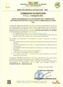 Tags: dgeÉLECTIONS DU 24 MAIGuinéeOUVERTURE DES DEMANDES D’ACCRÉDITATIONZEINAB CAMARA