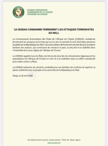 La communauté économique des États de l’Afrique de l’Ouest condamne les attaques qui ont secoué la République du Mali ce 25 avril 2026. L’organisation sous-régionale l’a exprimé dans un communiqué publié ce dimanche.